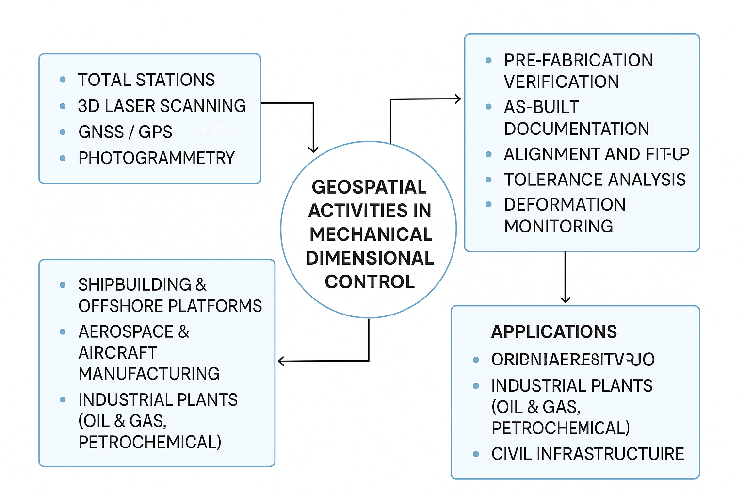 Geospatial activities in Mechanical Dimensional Control refer to the integration of geospatial technologies (like GPS, laser scanning, total stations, and 3D modeling) into mechanical and structural engineering processes to ensure precise dimensional accuracy of fabricated or assembled components. This is especially crucial in industries such as shipbuilding, aerospace, oil & gas, and industrial construction.